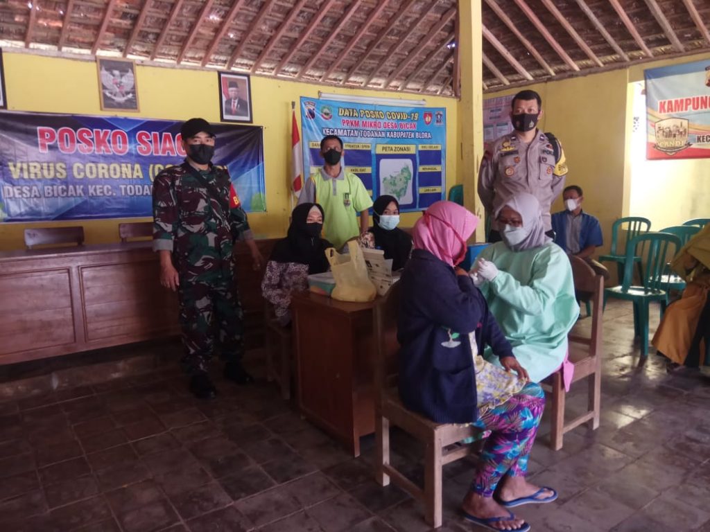 Bhabinkamtibmas desa Bicak Aipda Sri Jayanto bersama Babinsa Koramil Serda Ngarji melakukan pemantauan vaksinasi yang digelar di Balai Desa setempat, Jumat (22/10/2021).