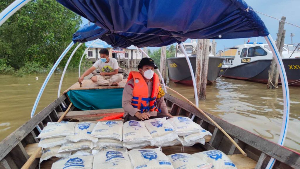 Kapolres memimpin langsung pelaksanaan distribusi beras dari Kapolda Jambi menggunakan Kapal Pompong Apung Vaksinasi Polri.