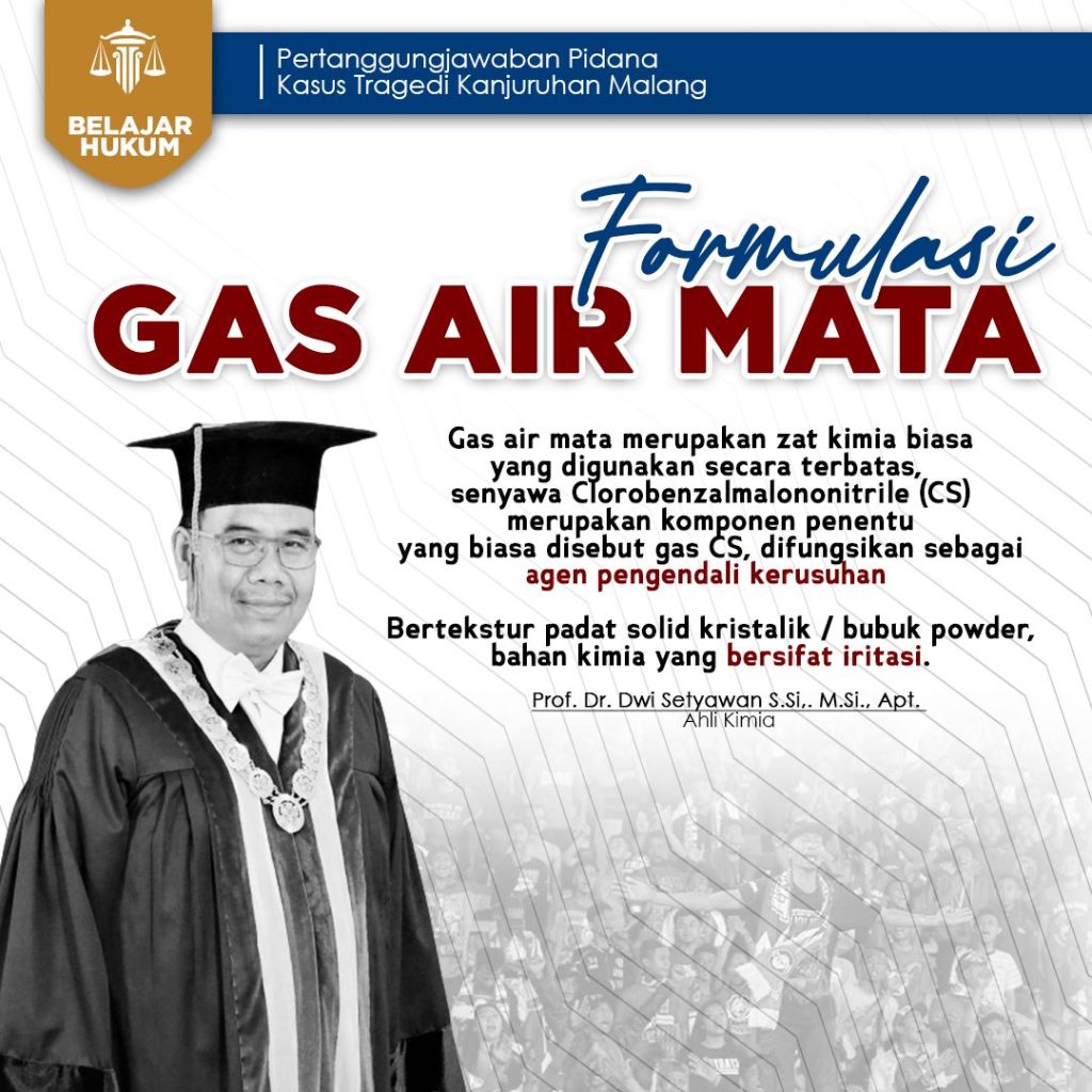 Prof. Dr. Dwi Setyawan, S.Si., M.Si., Apt selaku ahli kimia mengatakan formulasi gas air mata merupakan zat kimia biasa yang digunakan secara terbatas.