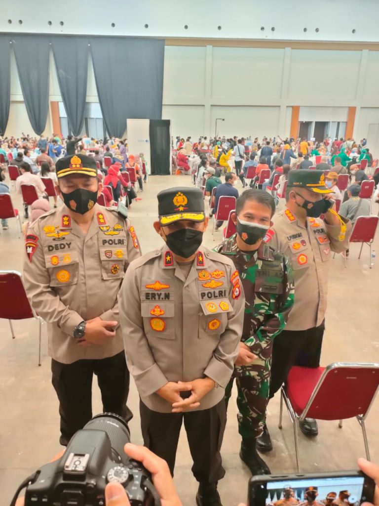 “Adapun jumlah masyarakat yang di vaksin dalam vaksinasi massal ini sebanyak 2074 orang. Dan untuk jumlah vaksinatornya, Polri sebanyak 105 personel, TNI sebanyak 7 Personel dan Dinkes sebanyak 140 personel. Dalam vaksinasi massal hari ini telah menghabiskan sebanyak 1835 dosis vaksin bio farma dan 239 dosis vaksin sinovac,” lanjut Edy Sumardi.