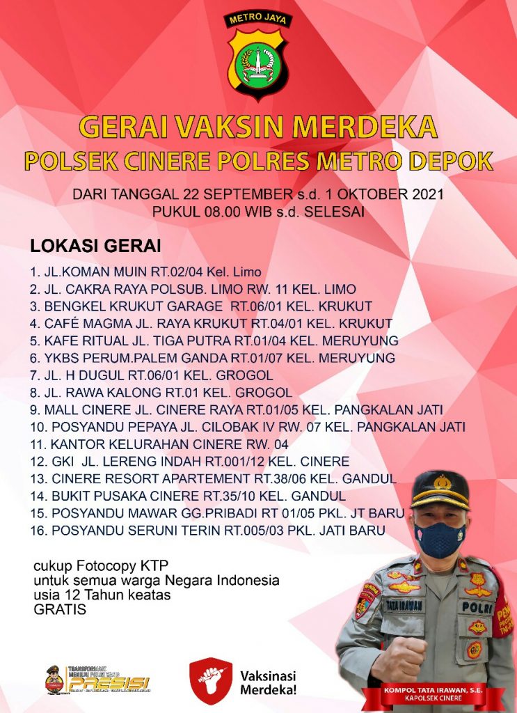 Kapolsek Cinere, Kompol Tata Irawan, SE mengatakan bahwa vaksinasi merdeka yang kami gelar sebanyak 16 gerai yang tersebar diwilayah Kecamatan Cinere, dan ini program vaksinasi ini kami gelar dari 22 September hingga 01 Oktober 2021.
