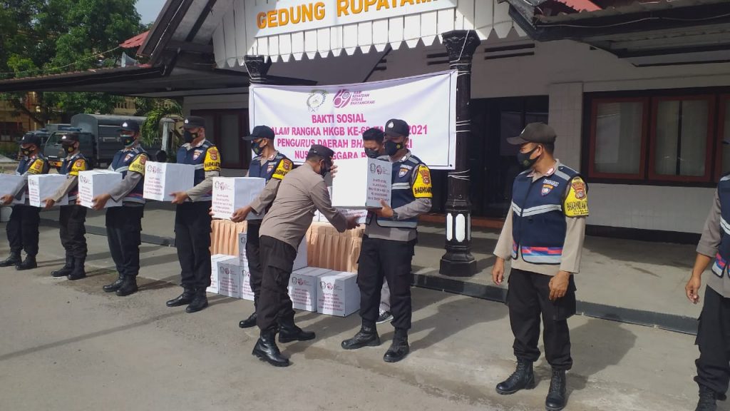 Sumbawa Besar- NTB, Dalam rangka memperingati Hari Kesatuan Gerak Bhayangkari (HKGB) ke-69, Bhayangkari Cabang Sumbawa Daerah Nusa Tenggara Barat menggelar bakti sosial dengan menyalurkan ratusan bantuan paket sembako.